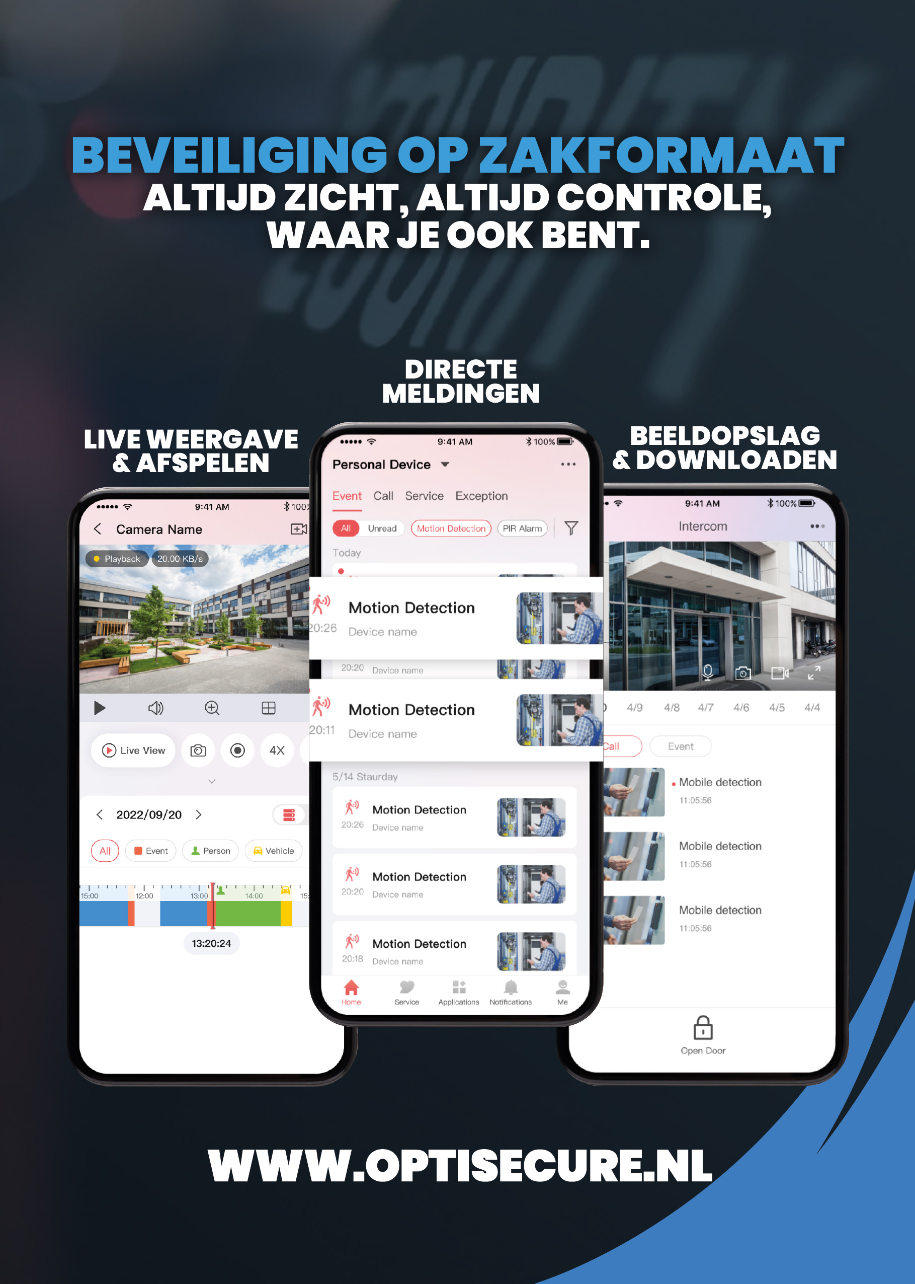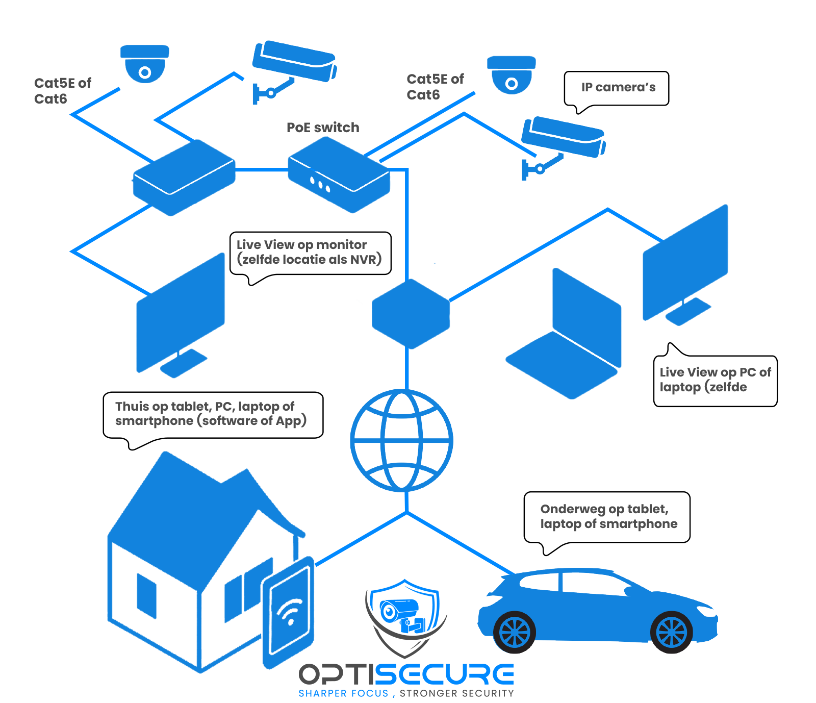 De technologische mogelijkheden zijn vandaag de dag enorm. OptiSecure helpt je navigeren door dit aanbod en adviseert onafhankelijk en deskundig. Afhankelijk van jouw wensen en locatie leveren we onder meer:
